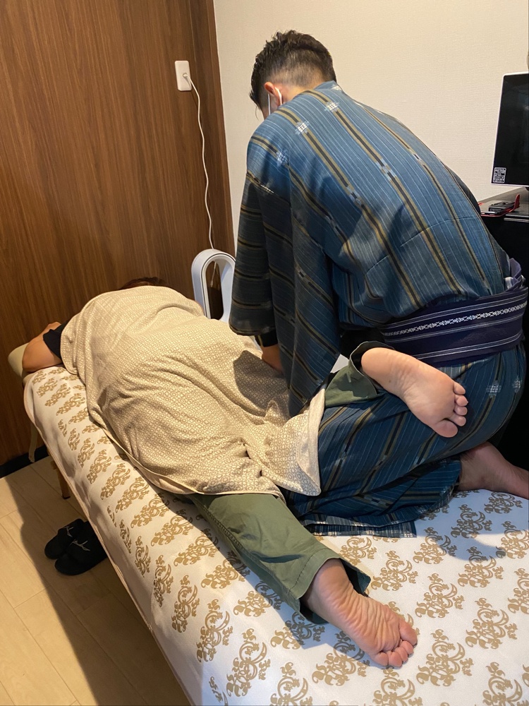 ※動画ではカットしていますが、通常専用の整体台を持参してマッサージを行います